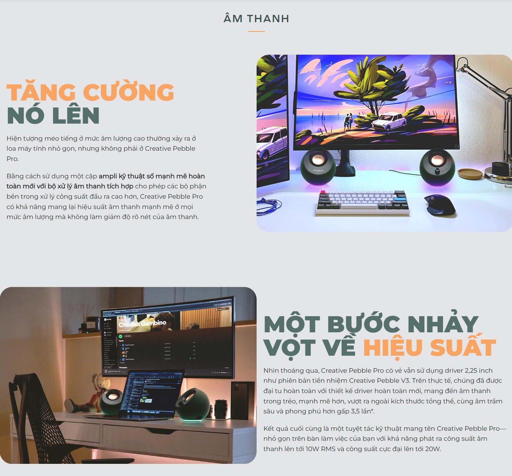 Creative Pebble Pro cung cấp công suất hệ thống lên tới 30W RMS (60W Peak) khi được cấp nguồn bằng Adapter PD 30W (Min.). Nhờ vào cấu hình 2.25 inch Full-range Drivers kết hợp với Passive Radiator, loa tạo ra dải âm rộng và mạnh mẽ (80–20,000 Hz). Ngay cả khi chỉ sử dụng nguồn USB 10W (5V 2A), loa vẫn đạt công suất 20W Peak, đủ sức lấp đầy không gian làm việc của bạn.