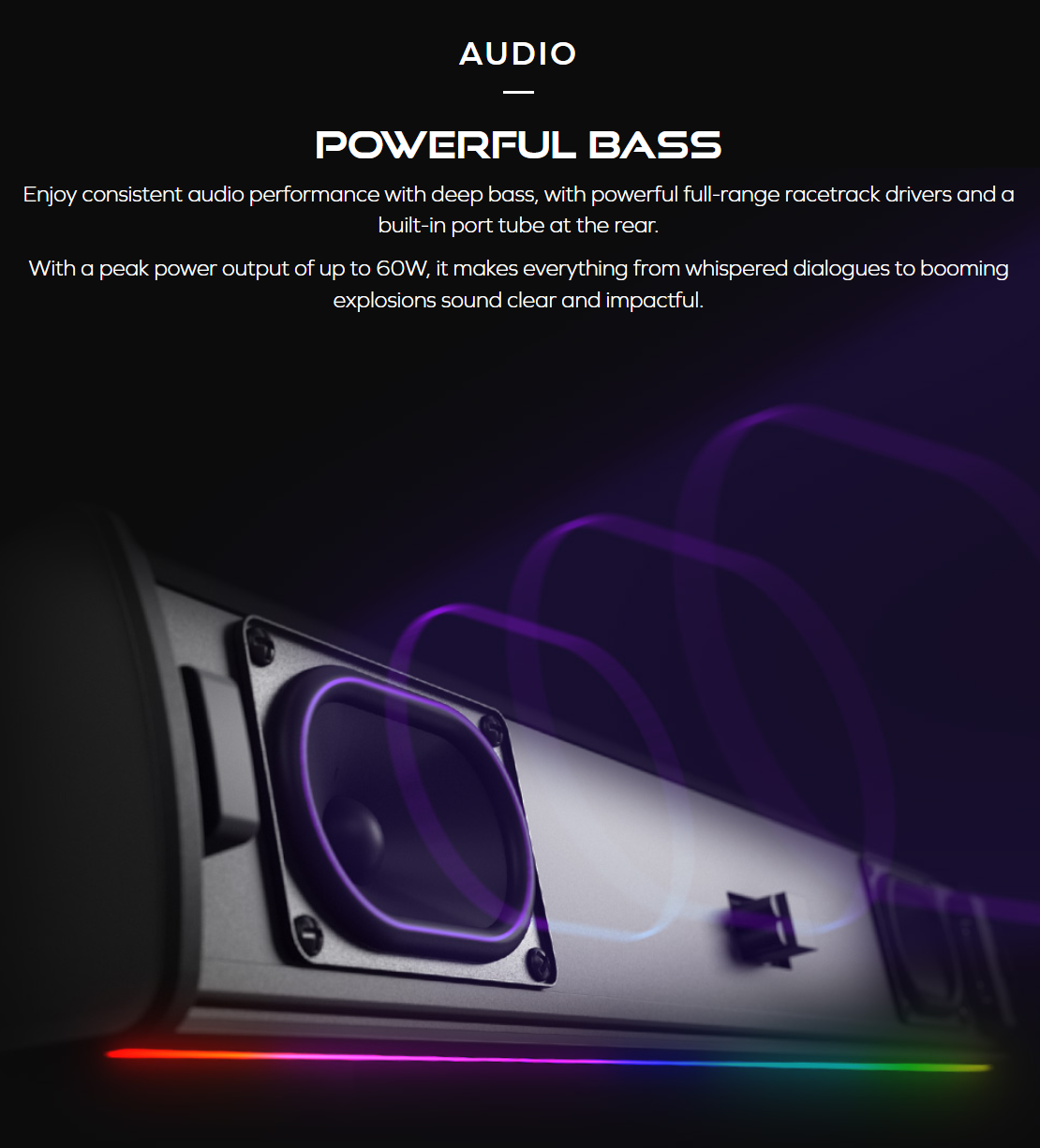 - Hiệu suất âm thanh mạnh mẽ: Tổng công suất 30W RMS (đỉnh 60W) mang lại âm thanh lớn, rõ ràng và chi tiết, với dải tần đáp ứng rộng từ 65–20,000 Hz, lý tưởng cho việc tái tạo tiếng bước chân và hiệu ứng cháy nổ trong game.