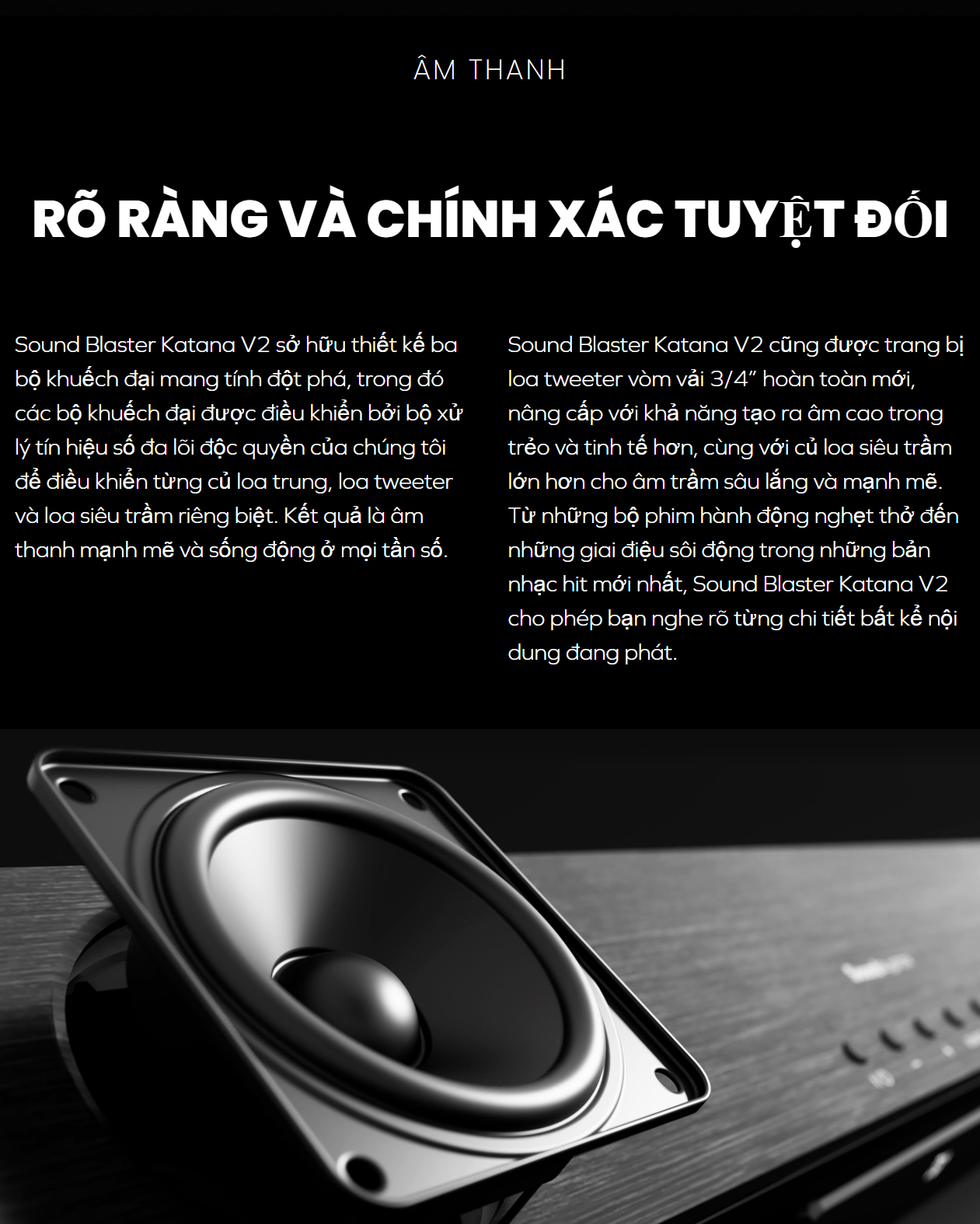 Sound Blaster Katana V2 sử dụng cấu hình 2.1 với 5 trình điều khiển (2 tweeter, 2 midrange và 1 subwoofer) được thiết kế riêng biệt, mang lại sự cân bằng hoàn hảo giữa âm trầm sâu lắng và âm cao rõ ràng.