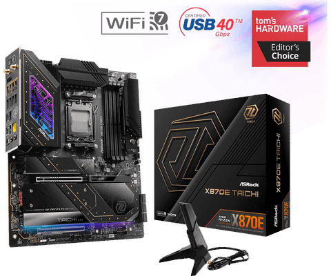 - Hỗ trợ CPU AMD Ryzen™ 7000, 8000 & 9000 series: X870E Taichi tương thích hoàn hảo với tất cả các CPU Ryzen sử dụng socket AM5, cho phép bạn khai thác tối đa sức mạnh của những vi xử lý mạnh mẽ nhất hiện nay.