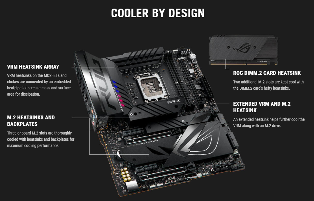Để "nuôi" được các con chip Core i9 ở mức xung nhịp cao dưới nitơ lỏng (LN2), Apex Encore sở hữu dàn VRM cực khủng với 24 tầng nguồn (105A mỗi tầng). Hệ thống tản nhiệt VRM khổng lồ được nối liền bằng ống dẫn nhiệt (heatpipe) giúp bo mạch chủ luôn mát mẻ và ổn định trong những điều kiện khắc nghiệt nhất.