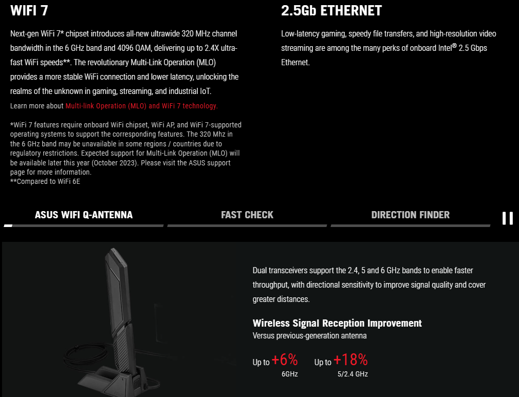 Dark Hero là một trong những bo mạch chủ tiên phong tích hợp tiêu chuẩn WiFi 7, mang lại băng thông rộng hơn và tốc độ nhanh hơn đáng kể so với WiFi 6E. Đi kèm với ăng-ten ASUS Q-Antenna thiết kế mới, việc thu phát tín hiệu trở nên ổn định hơn và thao tác lắp đặt cũng dễ dàng hơn bao giờ hết.