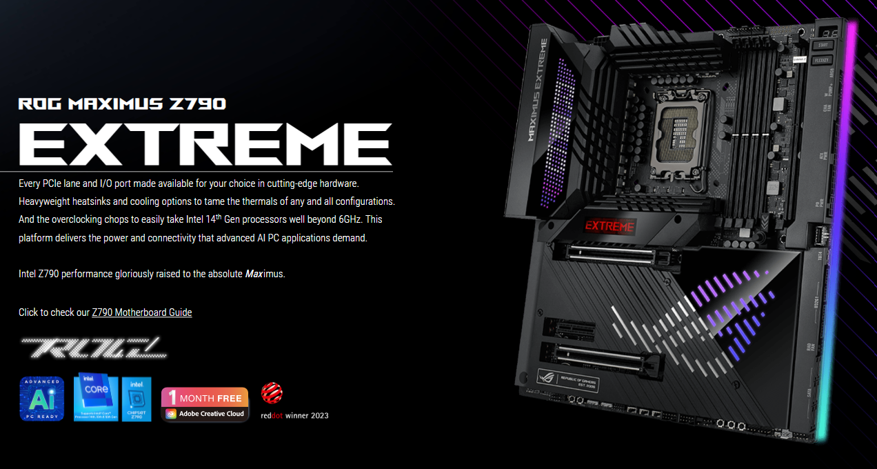 Mainboard ASUS ROG MAXIMUS Z790 EXTREME là "vị vua" của mọi bo mạch chủ. Nó không dành cho số đông, nó dành cho những người muốn nắm giữ tương lai của máy tính trong tay. Với Extreme, giới hạn duy nhất chính là trí tưởng tượng của bạn.