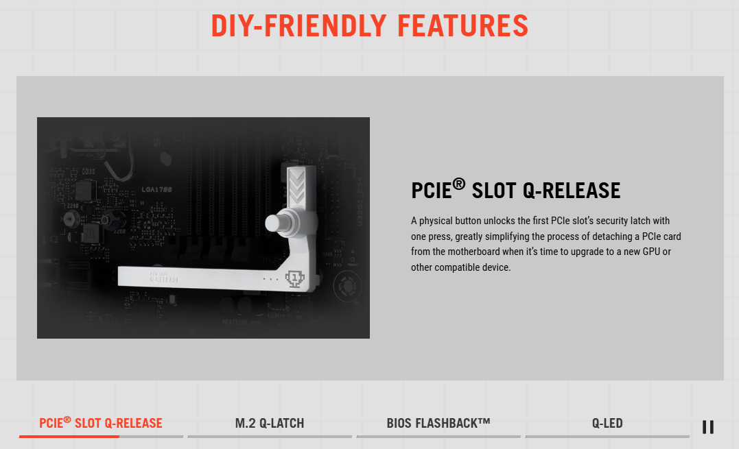 DIY-Friendly: PCIe Slot Q-Release (Nút bấm tháo VGA), M.2 Q-Latch (Chốt giữ SSD không cần vít).
