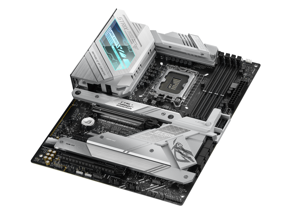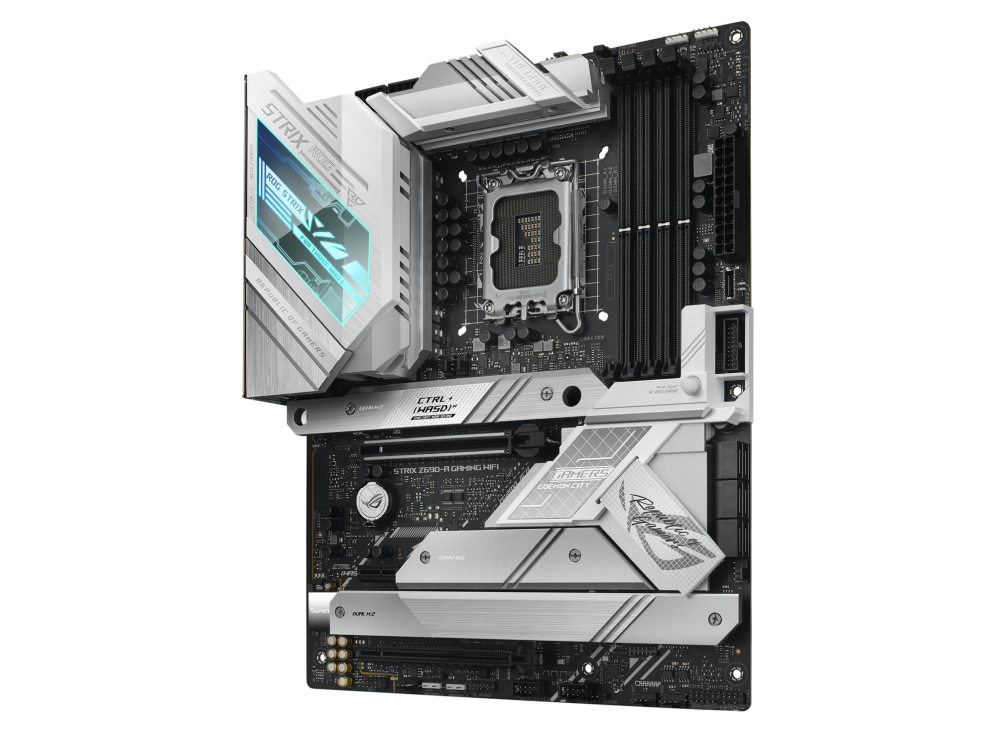 Z690-A tỏa sáng với lớp giáp tản nhiệt bằng nhôm màu bạc trắng được hoàn thiện tỉ mỉ, lắp trên nền mạch đen sâu thẳm. Logo ROG được tích hợp đèn RGB Aura Sync với hiệu ứng chuyển màu mượt mà, biến chiếc mainboard thành một tác phẩm nghệ thuật bên trong thùng máy tone trắng.