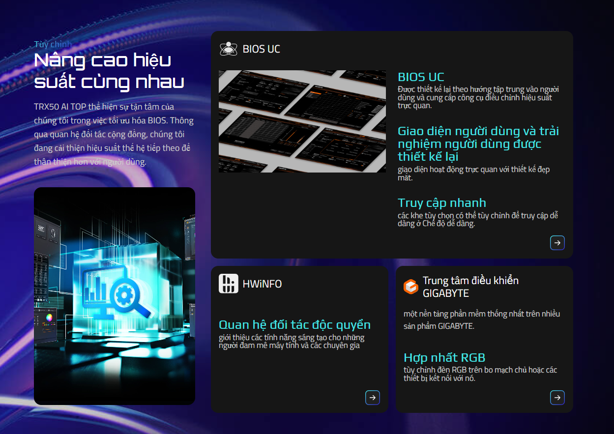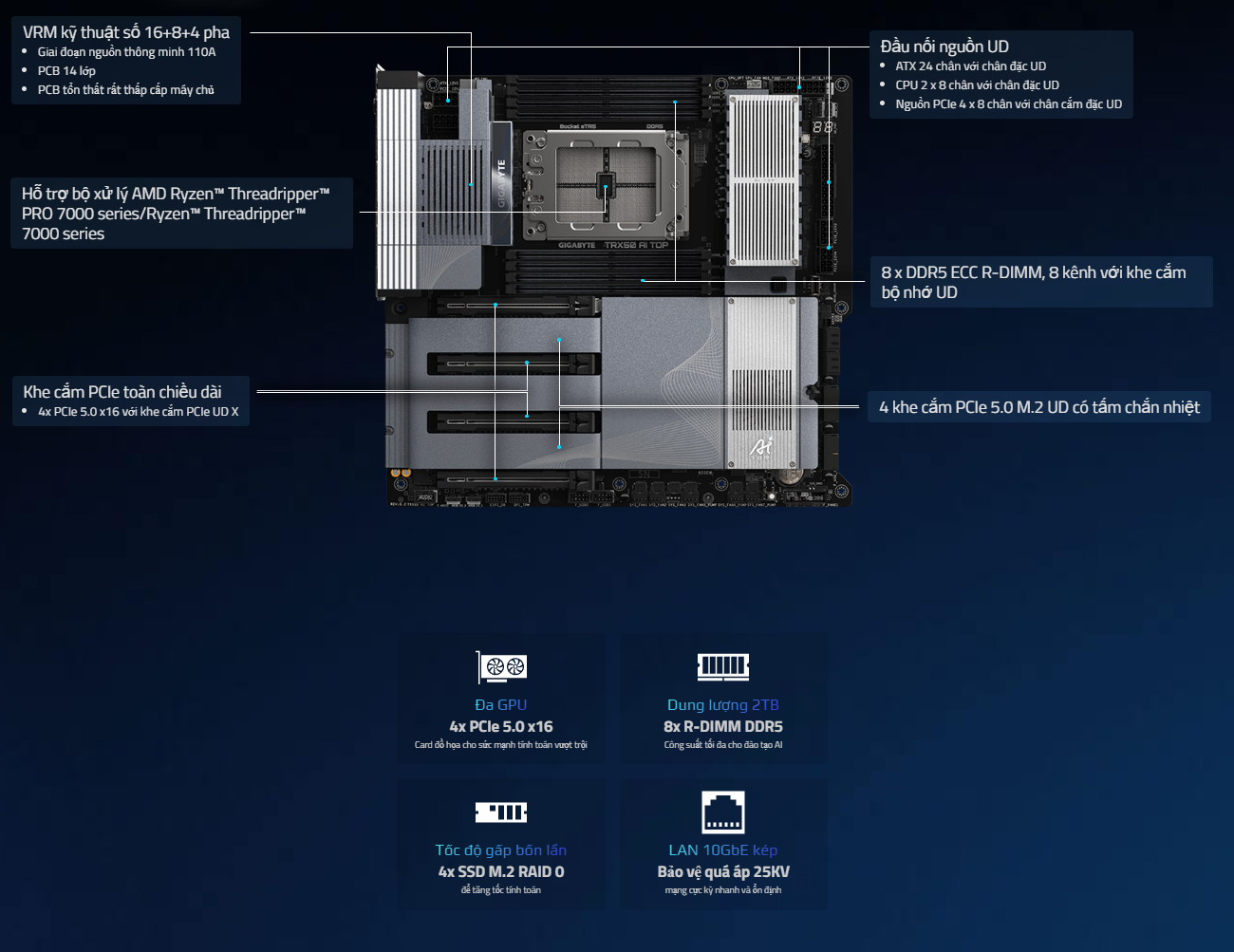 GIGABYTE TRX50 AI TOP: Biến bàn làm việc thành trung tâm AI. Sức mạnh đột phá, hiệu suất không giới hạn, kết nối toàn diện cho mọi dự án phức tạp - BP STORE