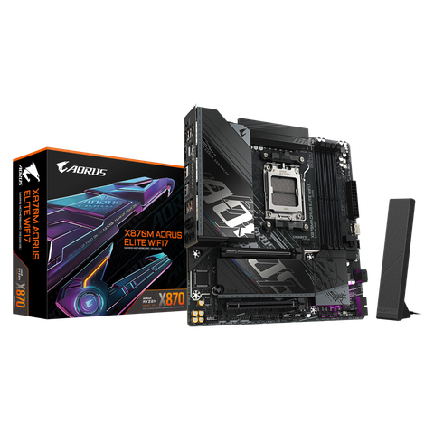 Mainboard GIGABYTE X870M AORUS ELITE WIFI7 là bo mạch chủ Micro ATX (m-ATX) tiên tiến, được thiết kế để khai thác sức mạnh tối đa của các bộ vi xử lý AMD Ryzen™ 7000, 8000 và 9000 Series trên Socket AM5. Sử dụng chipset AMD X870 mạnh mẽ, mainboard này tích hợp đầy đủ các công nghệ hàng đầu như hỗ trợ bộ nhớ DDR5 8200MHz, giao tiếp PCIe 5.0 tốc độ cao, và đặc biệt là kết nối không dây Wi-Fi 7 cùng cổng USB4® siêu nhanh, biến nó thành nền tảng hoàn hảo cho một cỗ máy chơi game hoặc làm việc chuyên nghiệp, nhỏ gọn.