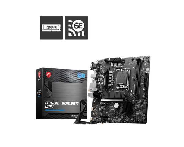 Mainboard MSI B760M BOMBER WIFI DDR5 là dòng bo mạch chủ được thiết kế để mang lại hiệu suất vượt trội cho các dàn máy gaming và đồ họa tầm trung. Hỗ trợ các dòng vi xử lý Intel® Core™ thế hệ 12, 13 và 14 (Socket 1700), sản phẩm gây ấn tượng mạnh với khả năng tương thích chuẩn RAM DDR5 tốc độ cao. Với sự xuất hiện của module Wi-Fi 6E tích hợp, MSI B760M BOMBER WIFI không chỉ mạnh mẽ về phần cứng mà còn cực kỳ linh hoạt trong kết nối, giúp bạn tối giản hóa không gian làm việc mà vẫn đảm bảo tốc độ internet nhanh nhất.