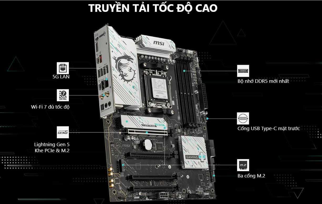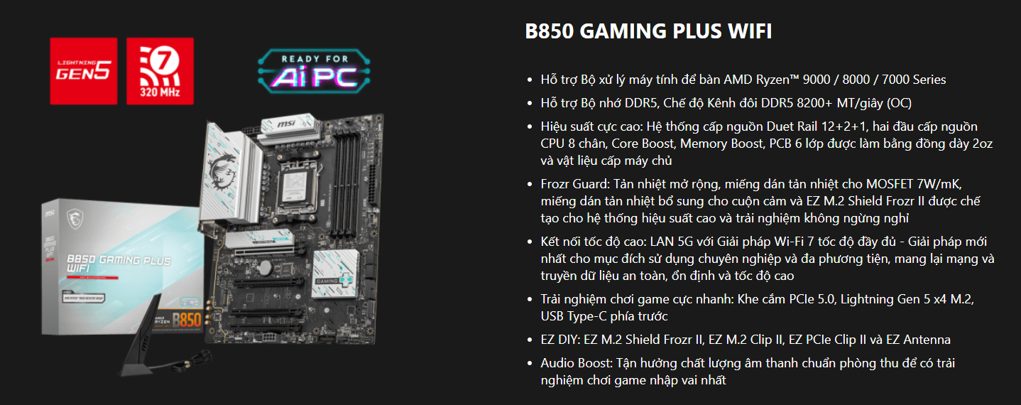 Mainboard MSI B850 GAMING PLUS WIFI là sự lựa chọn "vàng" cho game thủ AMD. Nó hội tụ đầy đủ các công nghệ cần thiết từ DDR5, Wi-Fi 6E đến hệ thống tản nhiệt tin cậy, giúp bạn hoàn toàn yên tâm tập trung vào những trận game đỉnh cao.