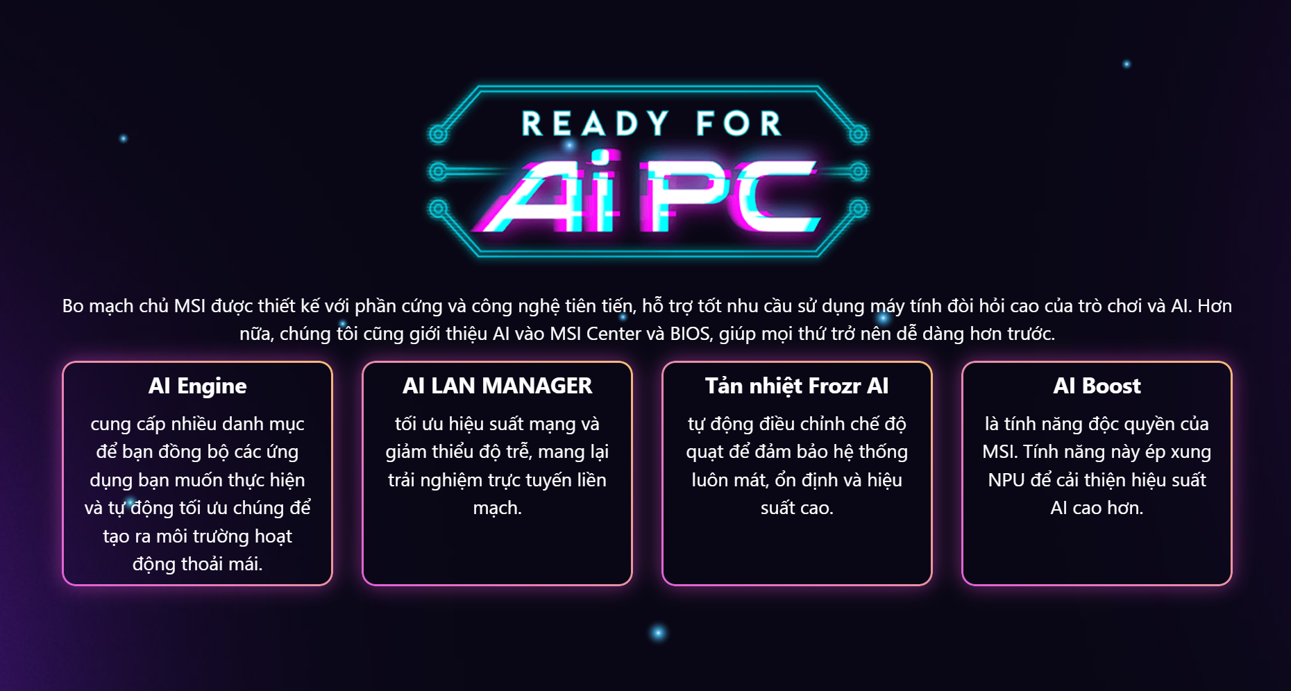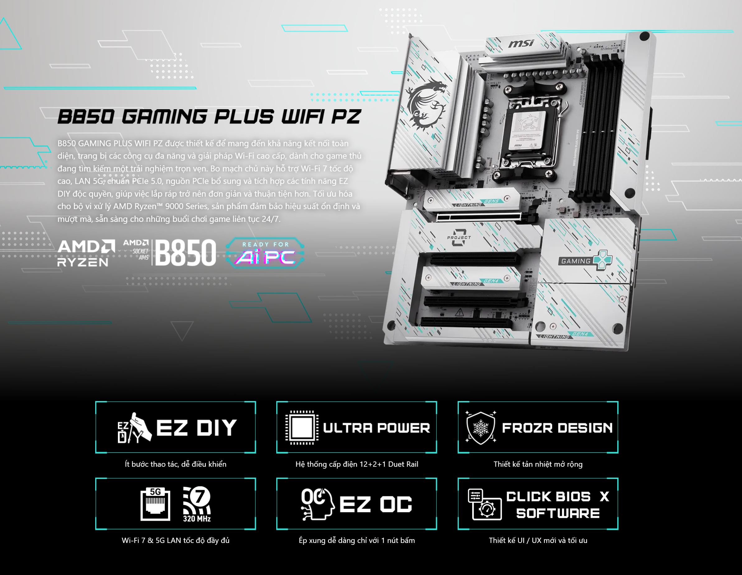 MSI B850 GAMING PLUS WIFI PZ mang đến sự cân bằng hoàn hảo giữa hiệu năng, khả năng mở rộng và độ ổn định. Đây là lựa chọn tối ưu cho game thủ và người dùng chuyên nghiệp muốn tận dụng sức mạnh của dòng CPU AMD Ryzen 9000 và chuẩn DDR5 mới nhất.