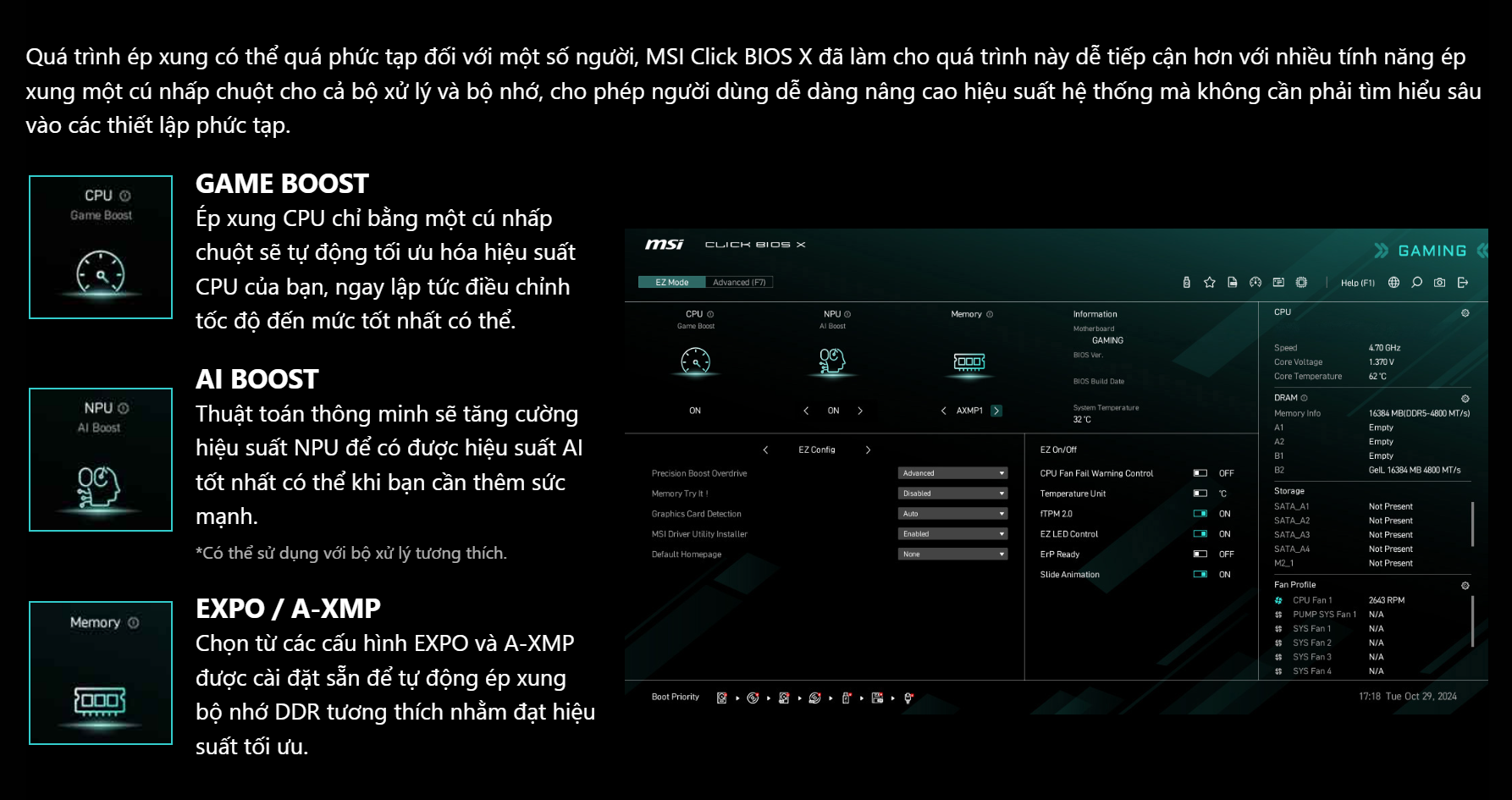 - Bộ nhớ: 4 khe DDR5, tối đa 256GB, hỗ trợ lên tới 8200MHz (OC)