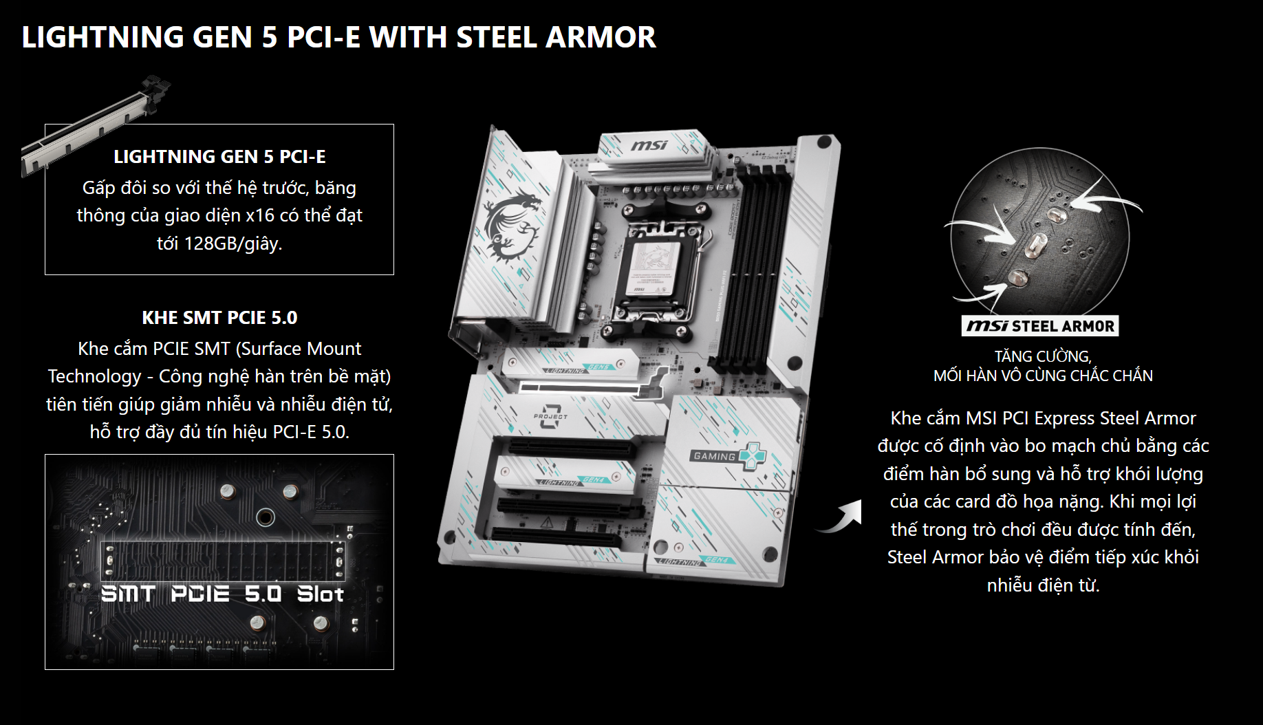 - Khe PCIe: 1x PCIe 5.0 x16, 1x PCIe 4.0 x4, 2x PCIe 3.0 x1