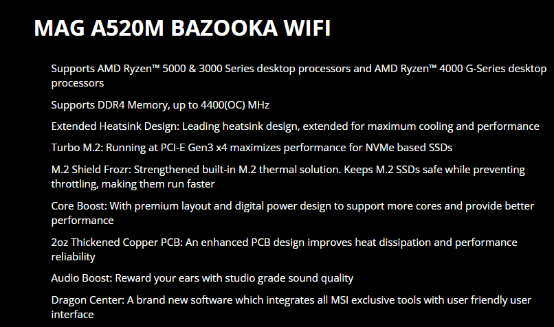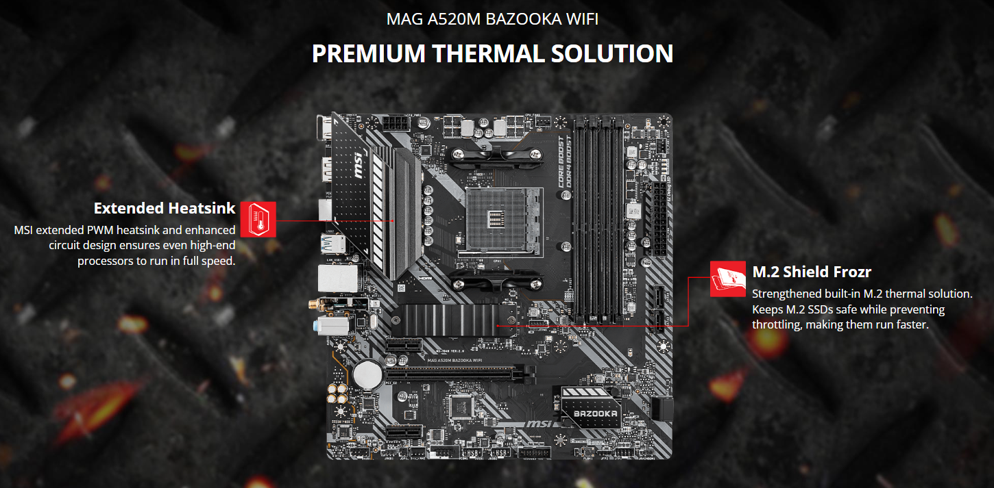 Mainboard MSI MAG A520M BAZOOKA WIFI hội tụ đầy đủ các yếu tố: bền, mát, và đầy đủ tính năng. Đây xứng đáng là chiếc bo mạch chủ "vô địch" trong phân khúc giá rẻ dành cho các tín đồ của đội Đỏ AMD.
