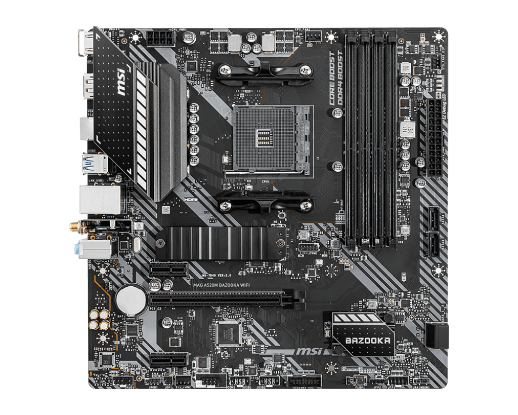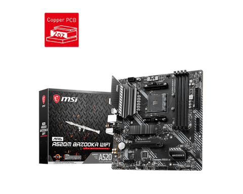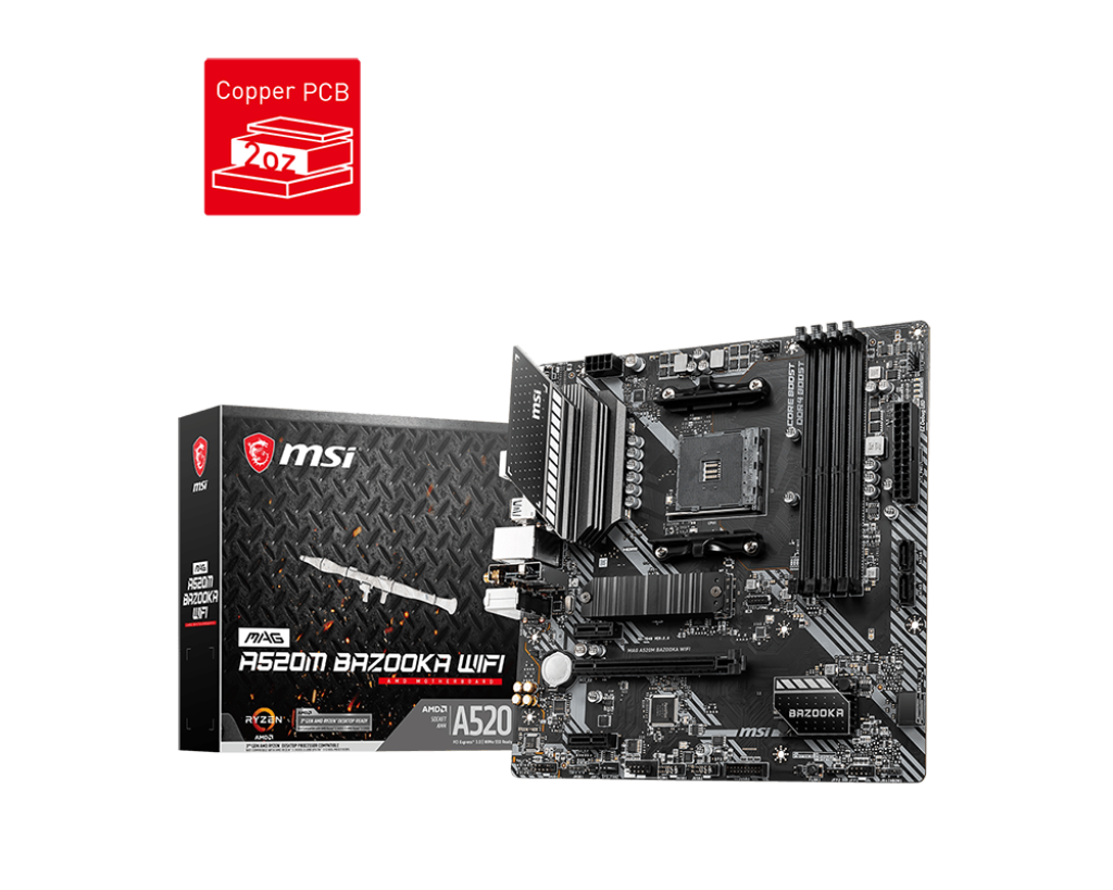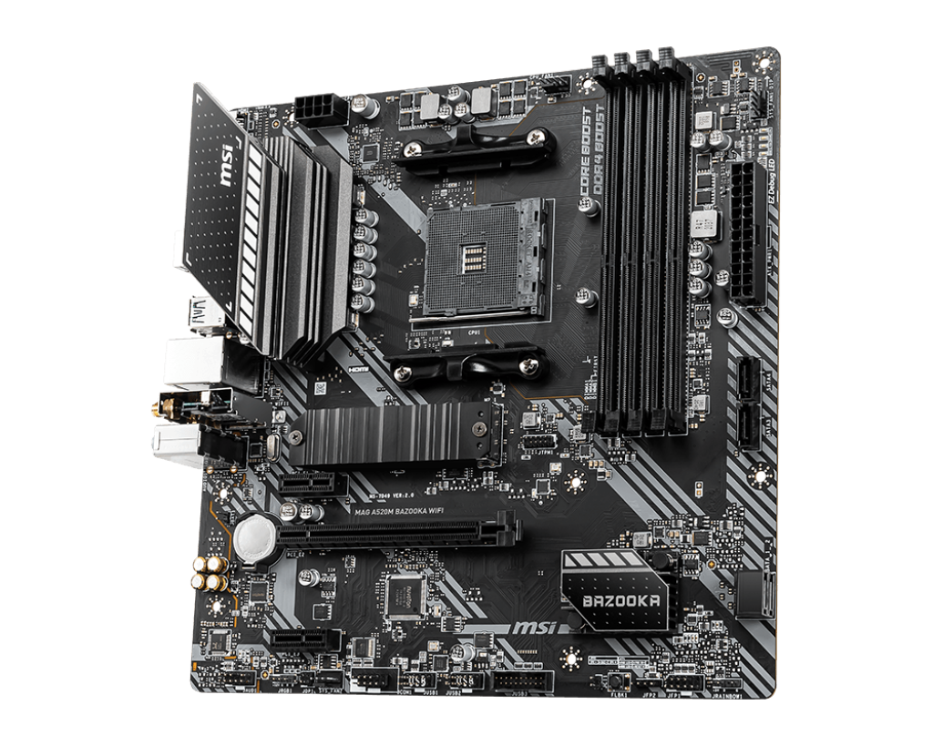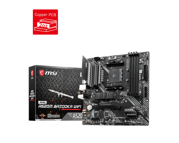 Mainboard MSI MAG A520M BAZOOKA WIFI là sự lựa chọn hoàn hảo cho những game thủ muốn xây dựng một hệ thống AMD Ryzen™ ổn định, bền bỉ mà không cần chi quá nhiều ngân sách cho các dòng chipset cao cấp. Với Socket AM4, bo mạch chủ này tương thích tốt với các dòng CPU Ryzen 3000, 4000G và 5000 Series. Chữ "BAZOOKA" đại diện cho thiết kế cứng cáp chuẩn quân đội, kết hợp cùng khả năng kết nối không dây Wi-Fi tích hợp, mang lại sự linh hoạt tuyệt vời cho không gian giải trí của bạn.