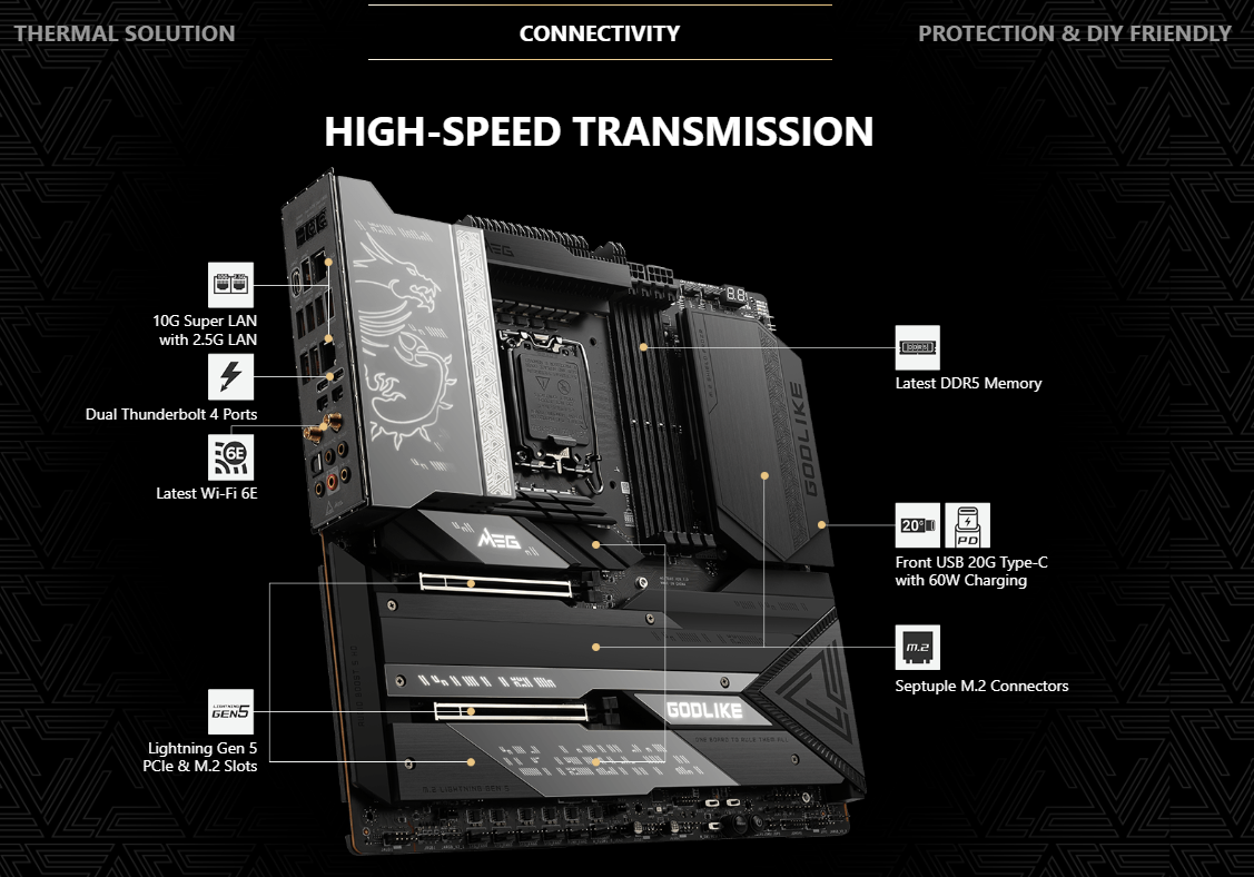 GODLIKE thiết lập một kỷ lục mới về lưu trữ với tổng cộng 7 khe cắm M.2 tích hợp (trong đó có 1 khe PCIe 5.0). Về kết nối, sản phẩm trang bị cổng mạng 10G Super LAN và 2.5G LAN, cùng chuẩn Wi-Fi 6E mới nhất. Đặc biệt, sự xuất hiện của hai cổng Thunderbolt 4 giúp tốc độ truyền tải dữ liệu và xuất hình ảnh đạt mức tối đa 40Gbps, đáp ứng mọi nhu cầu khắt khe nhất của giới sáng tạo chuyên nghiệp.