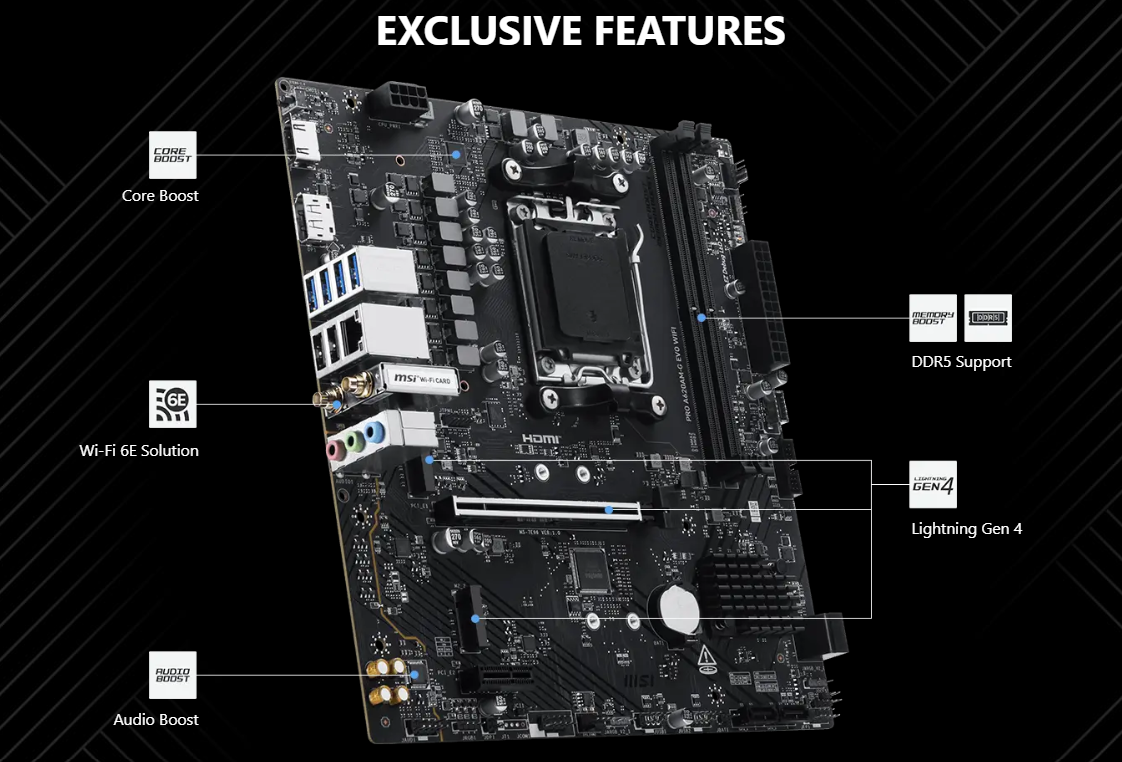 Dù nằm trong phân khúc phổ thông, MSI PRO A620AM-G EVO WIFI vẫn mang đến băng thông cực lớn của chuẩn DDR5. Công nghệ Memory Boost được tối ưu hóa giúp tín hiệu RAM luôn sạch, đảm bảo hệ thống vận hành mượt mà ngay cả khi xử lý đa nhiệm nặng. Kết hợp cùng Core Boost, bo mạch chủ cung cấp dòng điện chính xác và ổn định cho CPU, giúp khai thác tối đa sức mạnh của dòng Ryzen 7000/8000/9000 Series.