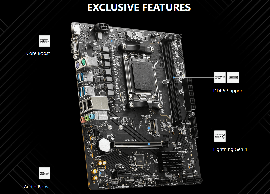 Dù có mức giá cực kỳ cạnh tranh, MSI PRO A620M-E vẫn hỗ trợ chuẩn bộ nhớ DDR5 tiên tiến. Công nghệ Memory Boost độc quyền của MSI cung cấp các tín hiệu dữ liệu thuần khiết nhất, giúp bộ nhớ đạt được hiệu suất cao và sự ổn định tuyệt vời khi xử lý đa nhiệm hay chạy các ứng dụng văn phòng nặng.
