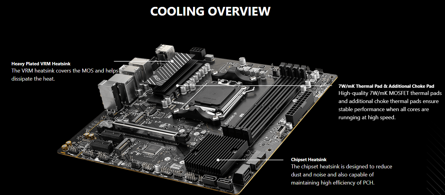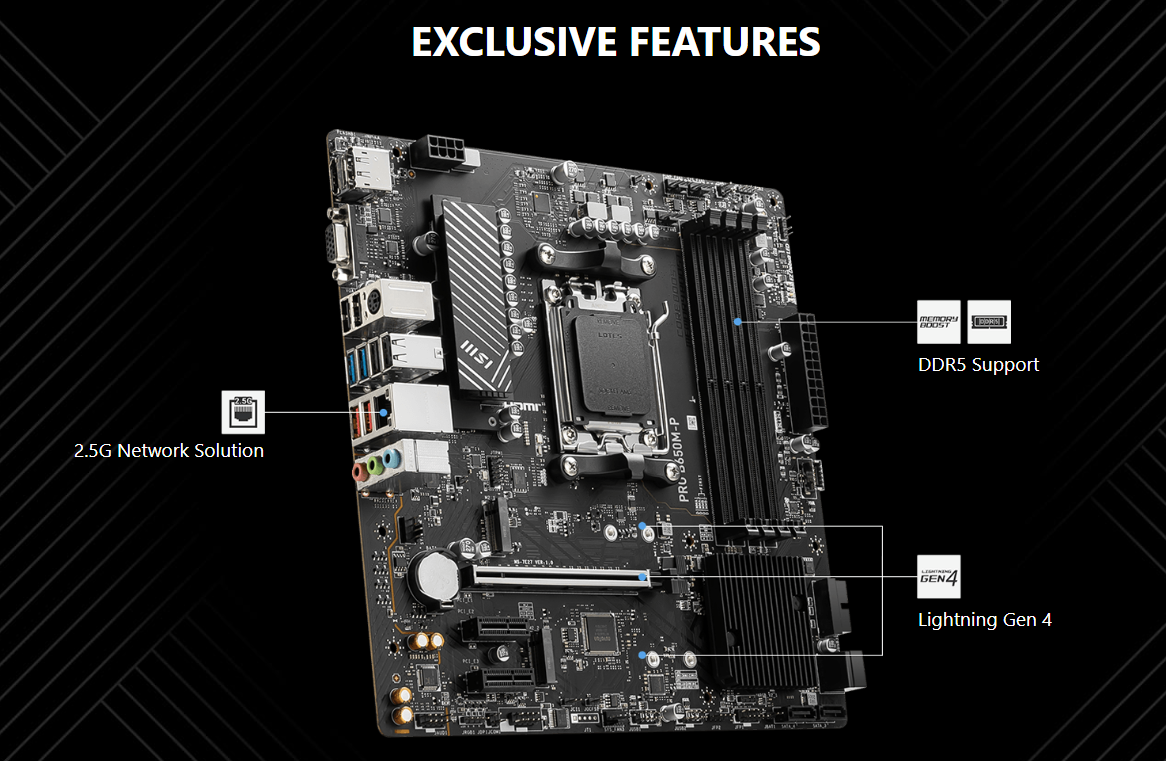 Để đáp ứng nhu cầu truyền tải dữ liệu lớn, MSI PRO B650M-P tích hợp cổng mạng 2.5G LAN với tốc độ nhanh gấp 2.5 lần so với mạng Gigabit thông thường. Hệ thống làm mát của mainboard cũng được thiết kế tối ưu với tính năng Frozr AI Cooling, cho phép tự động điều chỉnh tốc độ quạt dựa trên nhiệt độ của CPU và GPU, giúp bộ máy của bạn luôn mát mẻ và yên tĩnh.