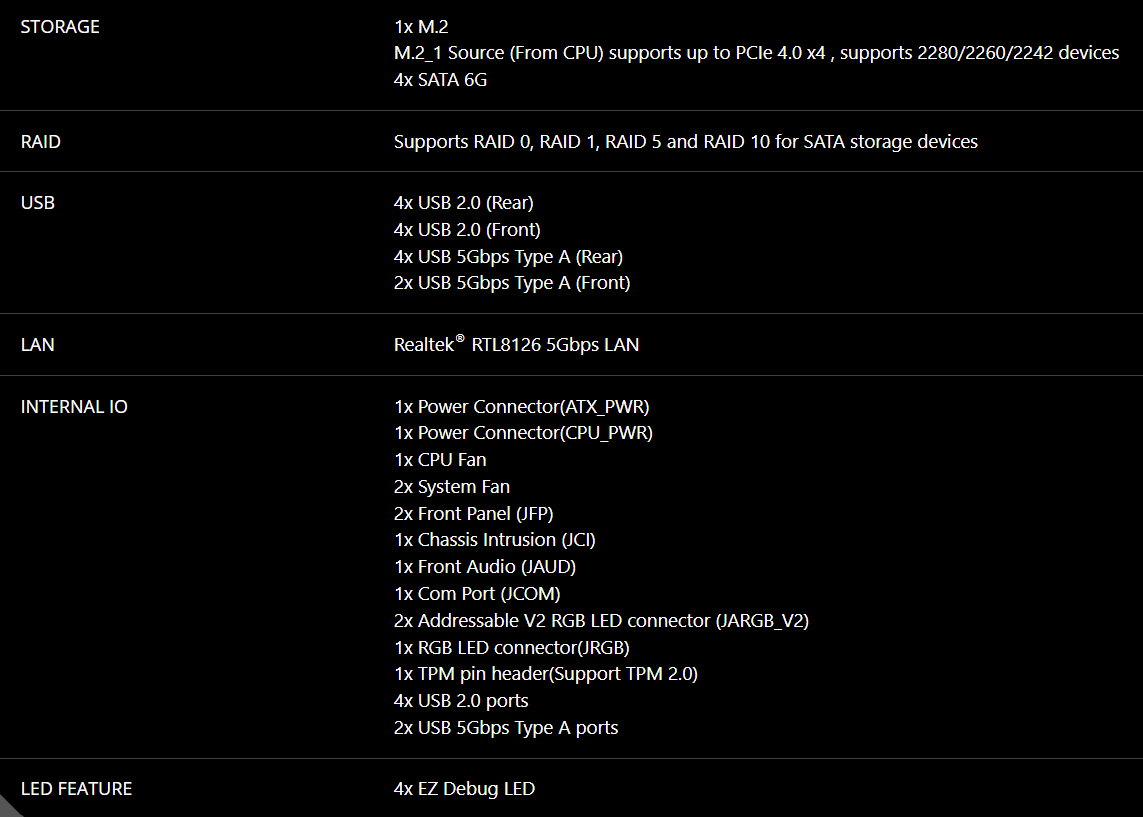 Lưu trữ: 2 x khe M.2 (Hỗ trợ PCIe Gen4 x4), 4 x cổng SATA 6Gb/s.
