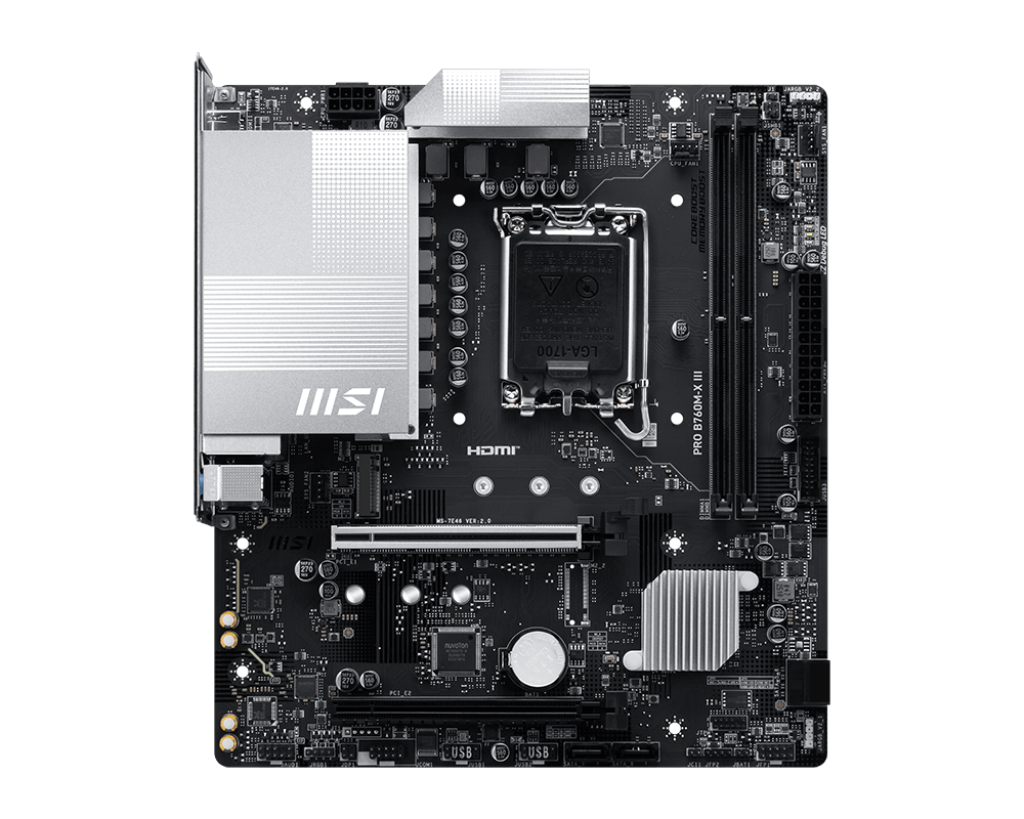 Mainboard MSI PRO B760M-X III là dòng bo mạch chủ được MSI tinh chỉnh để phục vụ tối đa cho năng suất công việc và giải trí hàng ngày. Với Socket LGA 1700, sản phẩm tương thích hoàn hảo với các dòng CPU Intel® Core™ thế hệ mới nhất. Điểm nâng cấp đáng giá trên phiên bản này chính là sự hỗ trợ hoàn toàn cho chuẩn RAM DDR5, giúp hệ thống của bạn đạt được băng thông rộng mở và tốc độ xử lý vượt trội so với các thế hệ cũ.