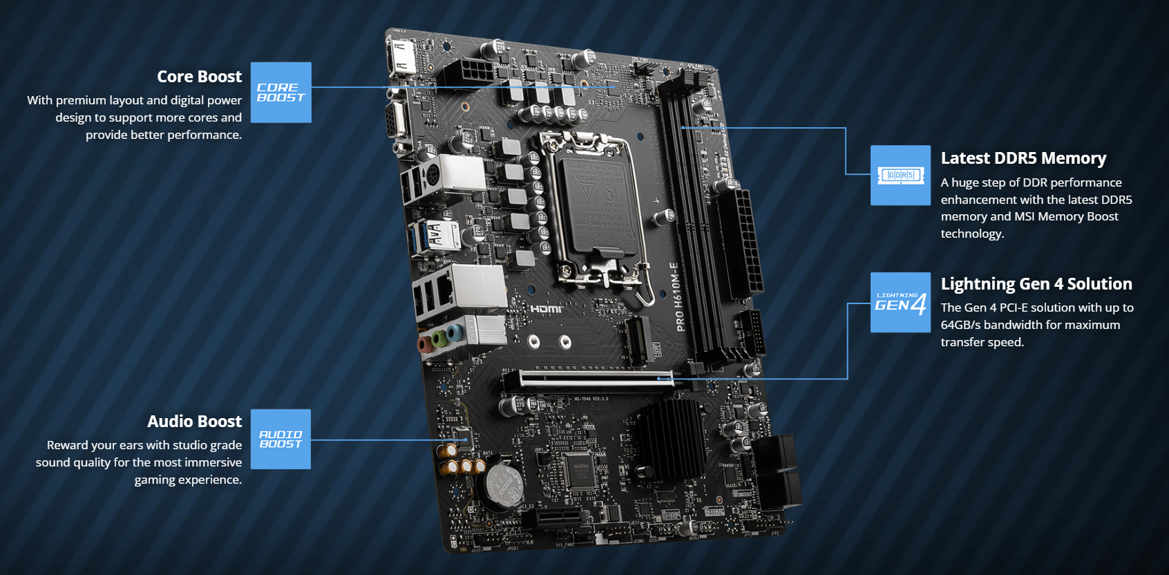 Mainboard MSI PRO H610M-E DDR5 được trang bị khe cắm PCIe chuẩn 4.0 với băng thông lên đến 64GB/s, giúp khai thác tối đa sức mạnh của các dòng card đồ họa hiện đại. Bên cạnh đó, khe cắm M.2 hỗ trợ chuẩn NVMe PCIe Gen3 x4 giúp tốc độ tải dữ liệu và khởi động ứng dụng trở nên nhanh chóng hơn bao giờ hết, tối ưu hóa thời gian làm việc trên MSI PRO H610M-E DDR5.