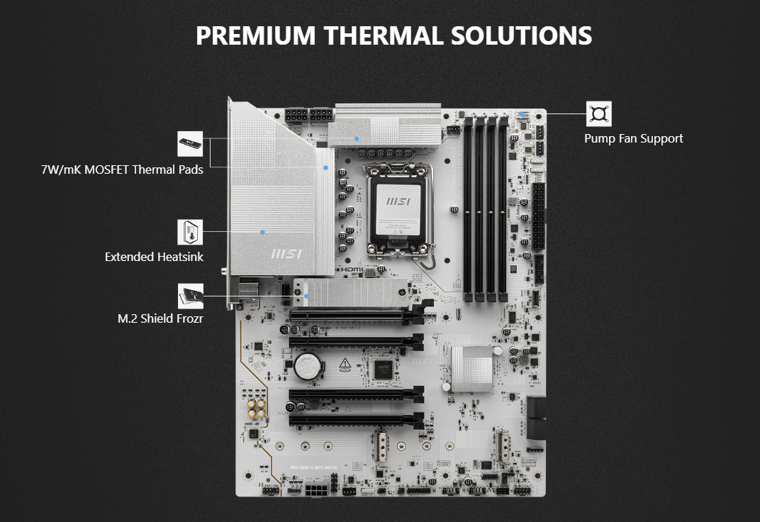 MSI PRO Z890-S WIFI WHITE hỗ trợ chuẩn RAM DDR5 với xung nhịp vượt trội nhờ công nghệ Memory Boost. Khe cắm PCIe 5.0 x16 bọc thép không chỉ sẵn sàng cho các dòng card đồ họa khủng nhất hiện nay mà còn đảm bảo băng thông rộng mở cho các thế hệ VGA tương lai, giúp dàn máy của bạn không bị lỗi thời.