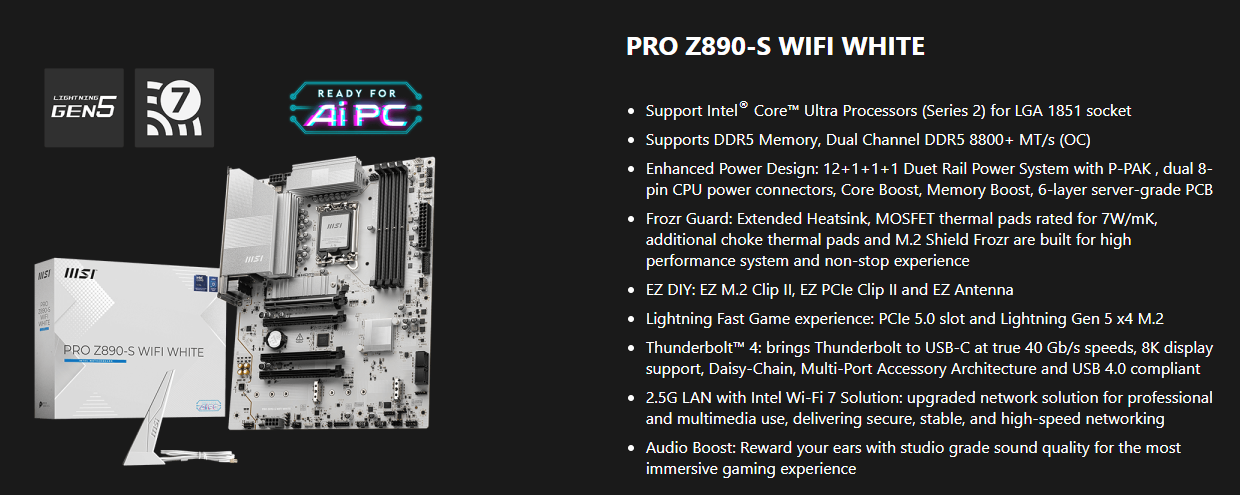 Mainboard MSI PRO Z890-S WIFI WHITE không chỉ là một chiếc bo mạch chủ, nó là một món đồ trang sức công nghệ đầy quyền năng. Với sự hỗ trợ của Wi-Fi 7 và cổng mạng 5G, đây chính là nền tảng hoàn hảo nhất để bạn bước vào kỷ nguyên điện toán mới.
