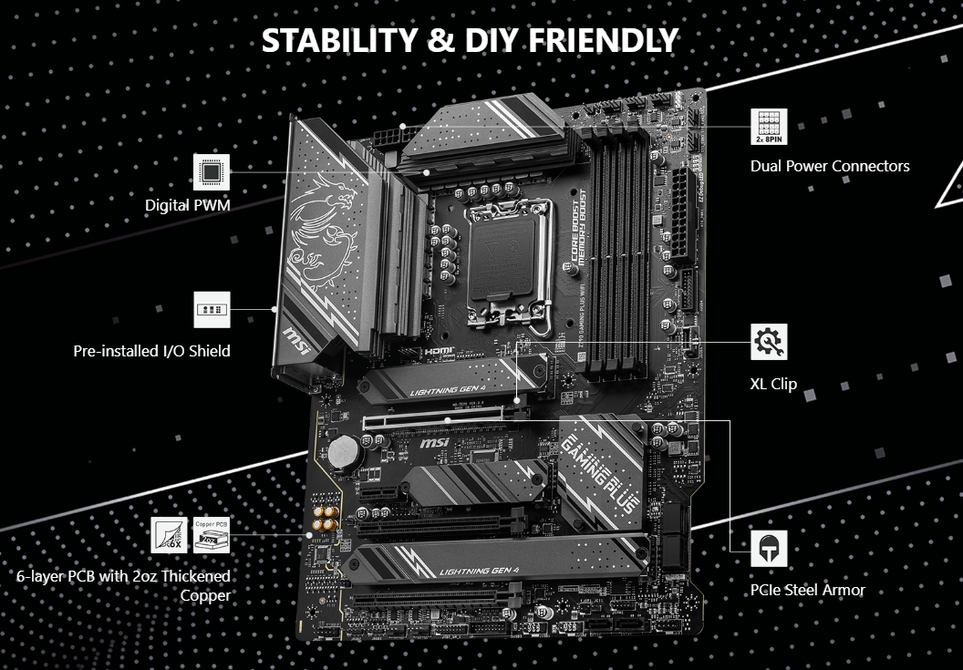 Bứt phá mọi giới hạn tốc độ với chuẩn bộ nhớ DDR5, hỗ trợ xung nhịp cực cao lên đến 7200+ MHz (OC) qua công nghệ Memory Boost. Đặc biệt, khe cắm PCIe 5.0 x16 với thiết kế Steel Armor bọc thép mang lại băng thông lên đến 128GB/s, đảm bảo khả năng tương thích hoàn hảo với các thế hệ card đồ họa mạnh mẽ nhất trong tương lai trên MSI Z790 GAMING PLUS WIFI.