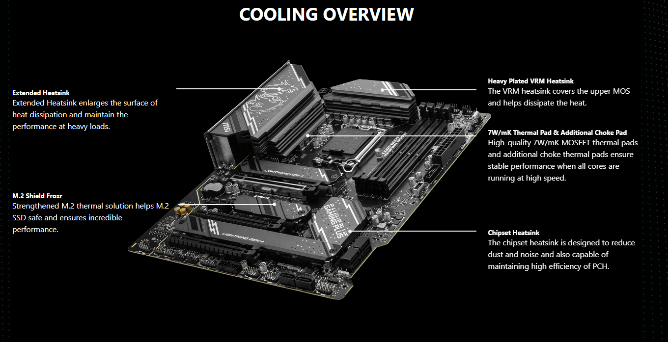 Duy trì tốc độ tối đa cho SSD của bạn nhờ miếng tản nhiệt M.2 Shield Frozr. Công nghệ này ngăn chặn hiện tượng quá nhiệt gây sụt giảm hiệu năng (throttling), đảm bảo các ổ cứng NVMe Gen4 của bạn luôn hoạt động ổn định nhất.