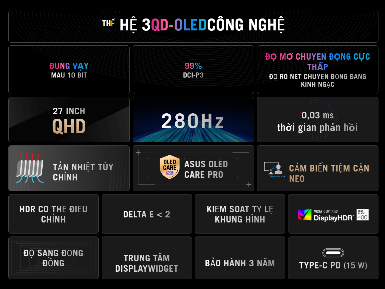 Tấm nền QD-OLED mang lại màu đen tuyệt đối, độ sáng HDR lên đến 1000 cd/m², cùng khả năng hiển thị 10-bit màu (1.07 tỷ màu). Độ phủ màu sRGB 135% và DCI-P3 99% giúp tái tạo hình ảnh trung thực, phù hợp cả cho gaming lẫn công việc sáng tạo nội dung. - Tốc độ quét 280Hz – Phản hồi 0.03ms siêu nhanh