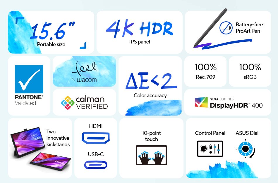 Asus ProArt PA169CDV không chỉ là một chiếc màn hình di động, mà là một bảng vẽ điện tử chuyên nghiệp với độ phân giải 4K UHD sắc nét. Đây là chiếc màn hình di động đầu tiên trên thế giới đạt cả hai chứng nhận danh giá là PANTONE Validated và Calman Verified, đảm bảo độ trung thực màu sắc tuyệt đối. Với sự hỗ trợ của bút Asus Pen tích hợp công nghệ Wacom EMR, các nghệ sĩ và nhà thiết kế có thể sáng tạo, phác thảo và chỉnh sửa trực tiếp trên màn hình với cảm giác tự nhiên như trên giấy.