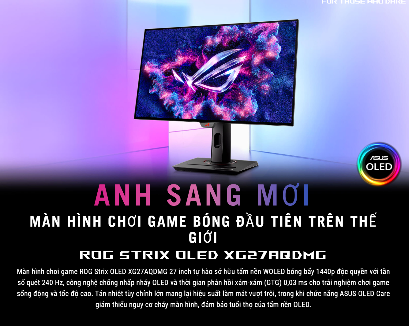 ASUS ROG Strix OLED XG27AQDMG là lựa chọn lý tưởng cho những ai muốn kết hợp giữa hiệu năng, tốc độ và chất lượng hình ảnh hàng đầu. Tấm nền WOLED 26.5 inch QHD, tần số quét 240Hz, phản hồi 0.03ms cùng công nghệ bảo vệ OLED tiên tiến giúp sản phẩm trở thành chuẩn mực mới trong thế giới màn hình gaming cao cấp.