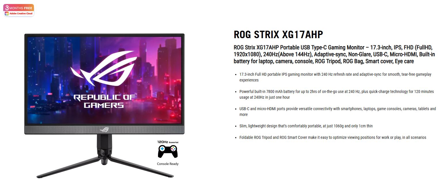 Màn hình Asus ROG STRIX XG17AHP (17.3inch/ FHD/IPS/240Hz) - Màn hình di động