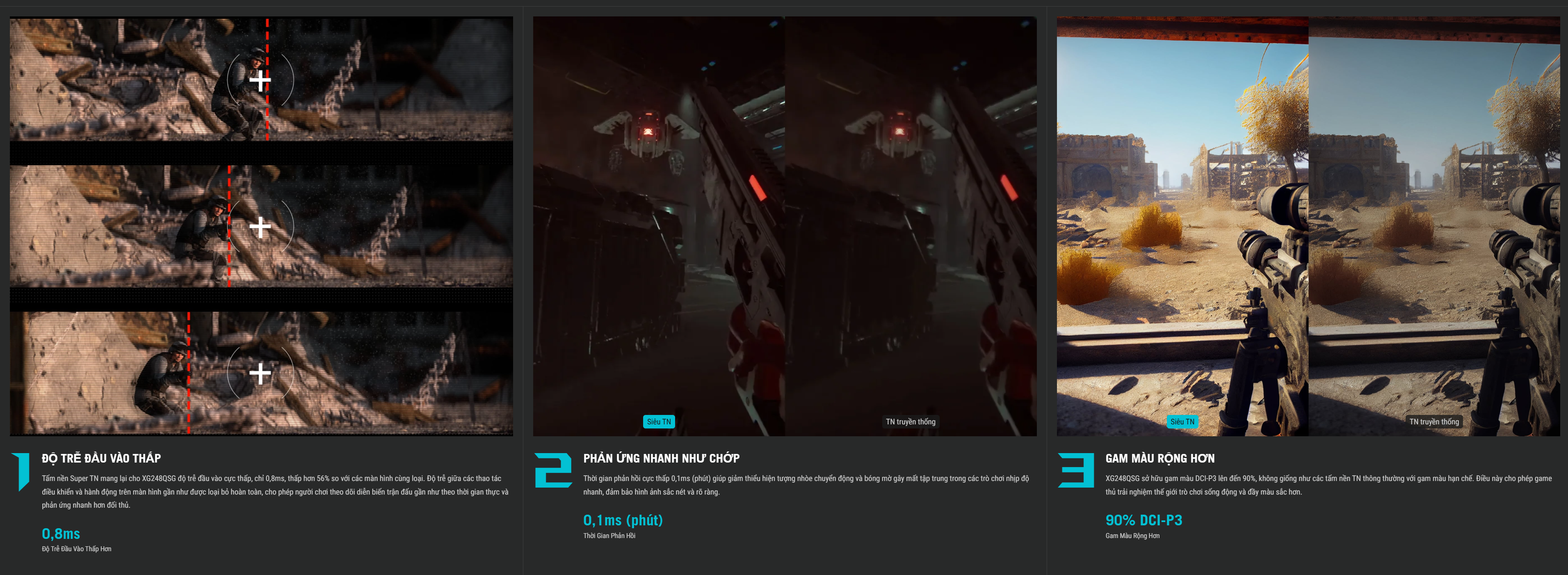 Công nghệ tấm nền Super TN và chất lượng hình ảnh cao: Tấm nền Super TN mang lại tốc độ phản hồi cực nhanh, là lựa chọn lý tưởng cho các màn hình có tần số quét cao. Màn hình còn hỗ trợ dải màu rộng với 90% DCI-P3 và 125% sRGB, cùng độ sáng 350cd/㎡ (lên đến 400cd/㎡ ở chế độ HDR) và độ chính xác màu △E< 2, giúp hình ảnh hiển thị sắc nét, sống động, chân thực. Hỗ trợ HDR10 cũng giúp tăng cường độ tương phản và chi tiết hình ảnh, mang lại trải nghiệm giải trí đỉnh cao.