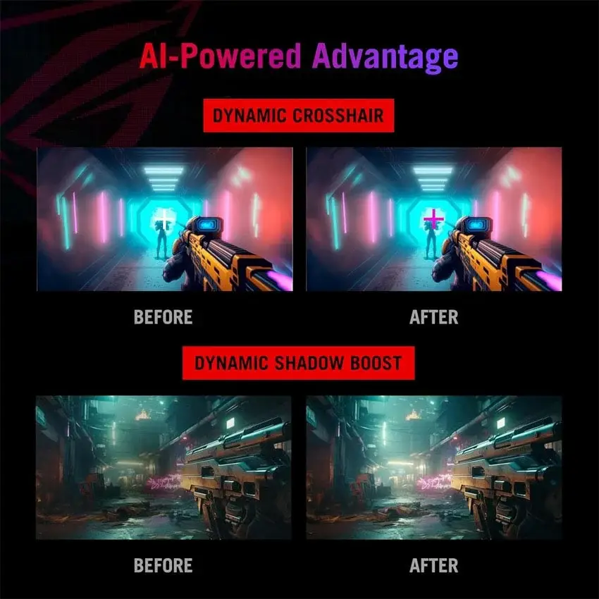 Trang bị AI Visual, Dynamic Crosshair, Dynamic Shadow Boost, tự động tối ưu độ sáng – tương phản theo từng cảnh, giúp người chơi dễ dàng quan sát đối thủ trong môi trường tối. - ELMB Sync & GameFast Input – Tối ưu tốc độ phản hồi