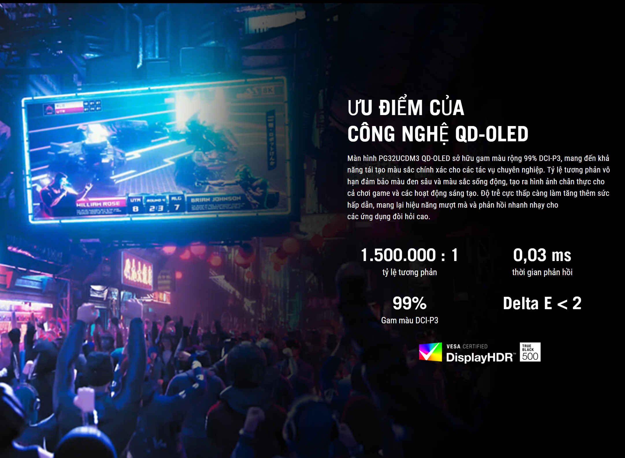 Không chỉ dành cho game thủ, PG32UCDM3 còn là công cụ đắc lực cho đồ họa với độ bao phủ màu 99% DCI-P3 và độ lệch màu Delta E < 2. Màn hình hỗ trợ HDR đa dạng bao gồm Dolby Vision và HDR10, đạt chuẩn VESA DisplayHDR True Black 400, giúp tái tạo vùng sáng chói và vùng tối sâu thẳm một cách hoàn hảo. Tính năng Uniform Brightness đảm bảo độ sáng đồng nhất trên toàn bộ bề mặt hiển thị.
