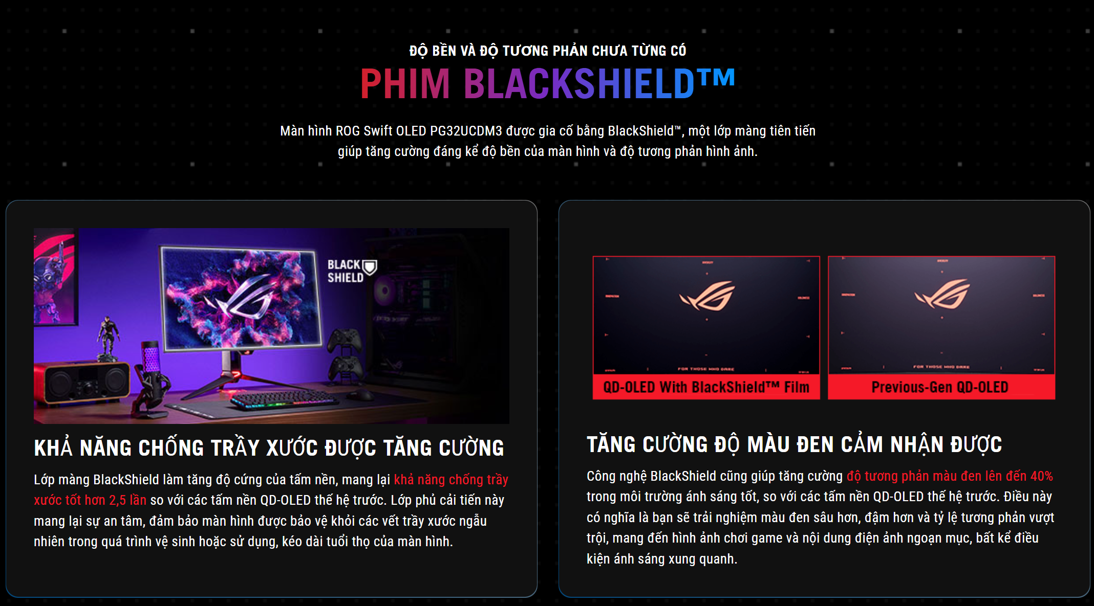Điểm khác biệt lớn nhất của thế hệ Gen3 chính là lớp phim BlackShield™ giúp tăng cường độ bền cho tấm nền và cải thiện độ tương phản hình ảnh. BlackShield™ giúp tăng mức độ hiển thị màu đen sâu hơn tới 40% trong môi trường có ánh sáng mạnh so với các tấm nền QD-OLED thế hệ trước. Điều này đảm bảo trải nghiệm thị giác rực rỡ và hình ảnh chuẩn điện ảnh bất kể điều kiện ánh sáng xung quanh.