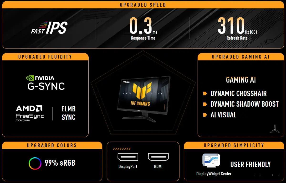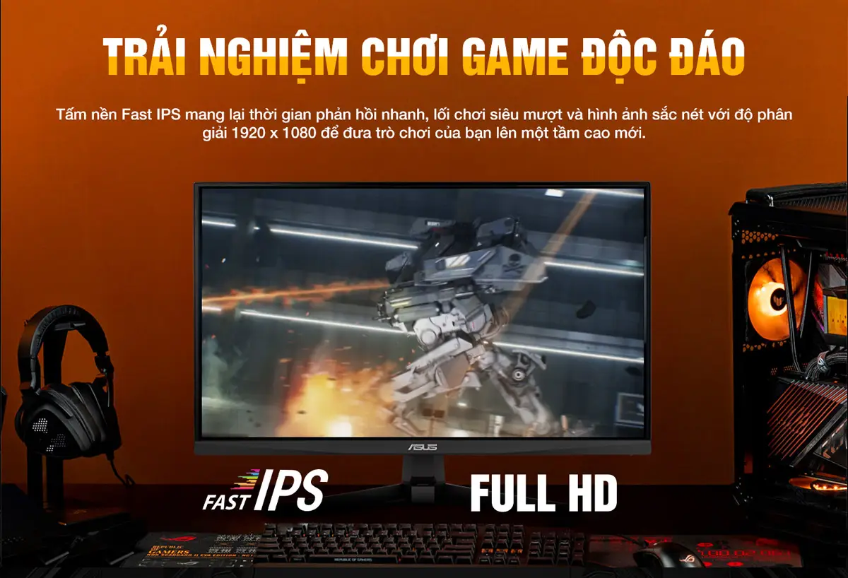 Công nghệ ASUS Fast IPS cho phép màn hình đạt thời gian phản hồi (min.), loại bỏ hoàn toàn hiện tượng bóng mờ, mang lại hình ảnh sắc nét, rõ ràng ngay cả trong các pha hành động tốc độ cao.