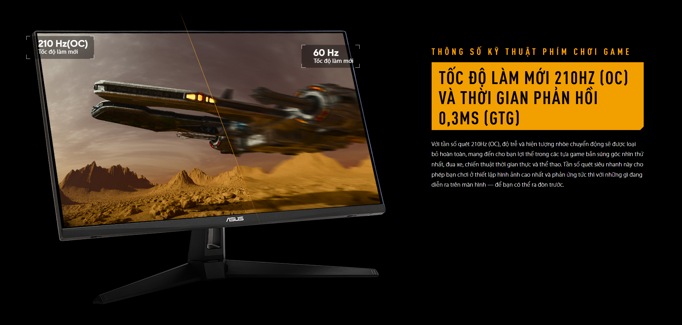 Tốc độ làm mới và thời gian phản hồi siêu nhanh: Điểm mạnh nhất của VG27AQ5A chính là tốc độ. Với tần số quét 210Hz khi ép xung, mọi chuyển động trong game đều cực kỳ mượt mà, giúp bạn dễ dàng theo dõi mục tiêu và phản ứng tức thì. Công nghệ ASUS Fast IPS cho phép màn hình đạt thời gian phản hồi 0.3ms (GTG), loại bỏ hoàn toàn hiện tượng bóng mờ, mang lại hình ảnh sắc nét, rõ ràng ngay cả trong những pha hành động tốc độ cao.