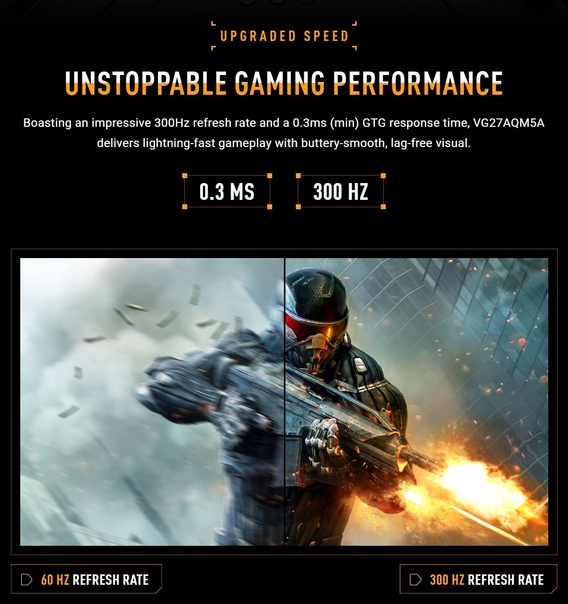 Với tốc độ làm tươi vượt trội 300Hz, VG27AQM5A mang lại trải nghiệm hiển thị cực kỳ mượt mà, giúp game thủ phát hiện và phản ứng nhanh hơn đối thủ. Đây là lợi thế quyết định trong các tựa game eSports cạnh tranh khốc liệt. - Thời gian phản hồi chỉ 0.3ms – Độ trễ gần như bằng không: