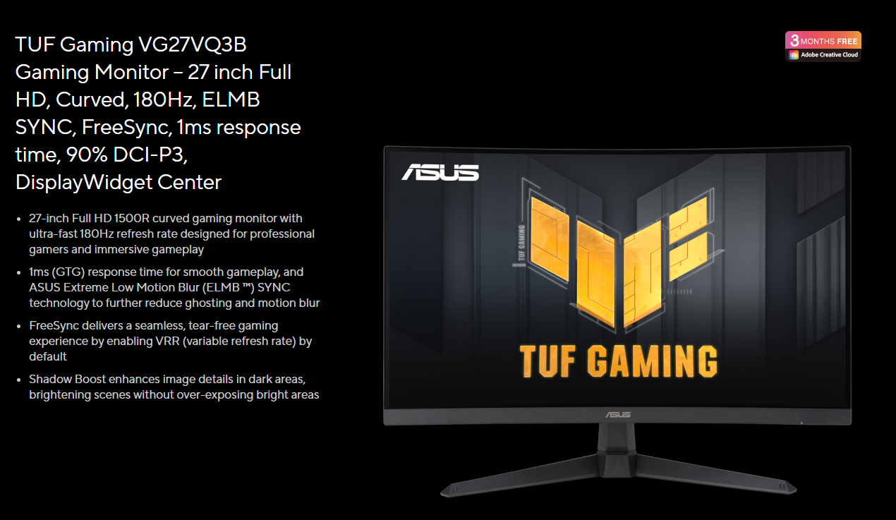Màn hình Asus TUF Gaming VG27VQ3B (27 inch/ FHD/VA/180Hz/Cong)