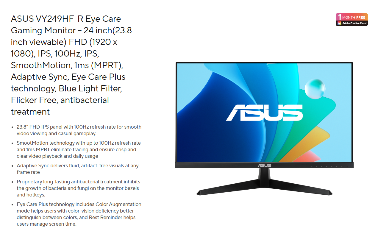 Màn Hình ASUS VY249HF-R là một lựa chọn lý tưởng cho người dùng hiện đại, không chỉ mang lại hiệu suất làm việc mượt mà với 100Hz/1ms và chất lượng hình ảnh IPS, mà còn tích hợp các công nghệ độc đáo nhằm bảo vệ sức khỏe người dùng như Kháng Khuẩn và Eye Care+. Đây là một sản phẩm cân bằng giữa công năng và sự chăm sóc.