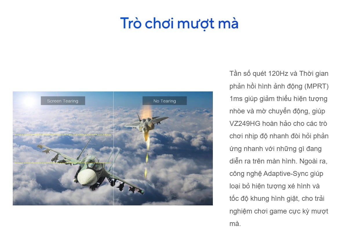 Tần số quét 120Hz kết hợp thời gian phản hồi 1ms MPRT mang đến chuyển động mượt, giảm thiểu bóng mờ. Công nghệ Adaptive-Sync và Motion Sync giúp đồng bộ khung hình, loại bỏ hiện tượng xé hình, đảm bảo trải nghiệm liền mạch trong cả chơi game lẫn xem video. - Bảo vệ mắt tối ưu với Eye Care+