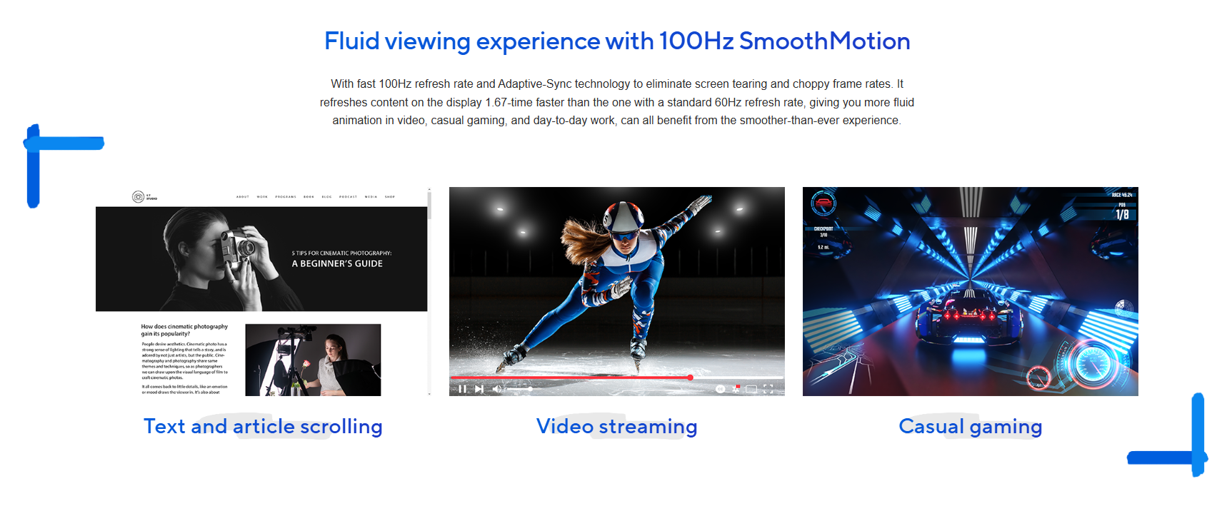 Kích thước 27 inch mang lại không gian hiển thị lớn. Tần số quét 100Hz là một cải tiến đáng kể so với màn hình 60Hz truyền thống, giúp chuyển động trở nên trôi chảy hơn. Thời gian phản hồi 1ms MPRT giảm thiểu hiện tượng nhòe chuyển động.