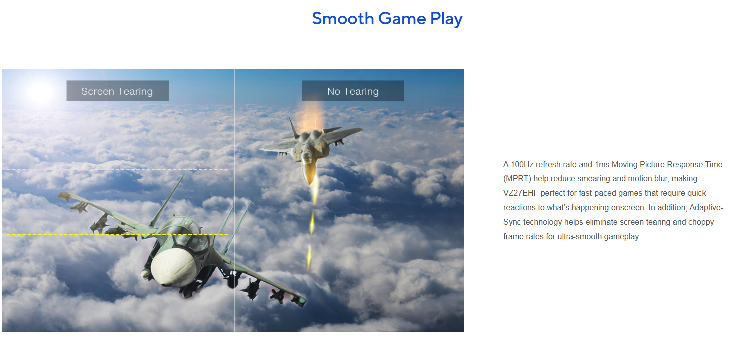 Tấm nền IPS của VZ27EHF cung cấp màu sắc nhất quán và góc nhìn rộng. Hỗ trợ công nghệ Adaptive-Sync (VRR Technology) qua cổng HDMI giúp loại bỏ hiện tượng xé hình, mang lại trải nghiệm xem video và chơi game ổn định hơn.