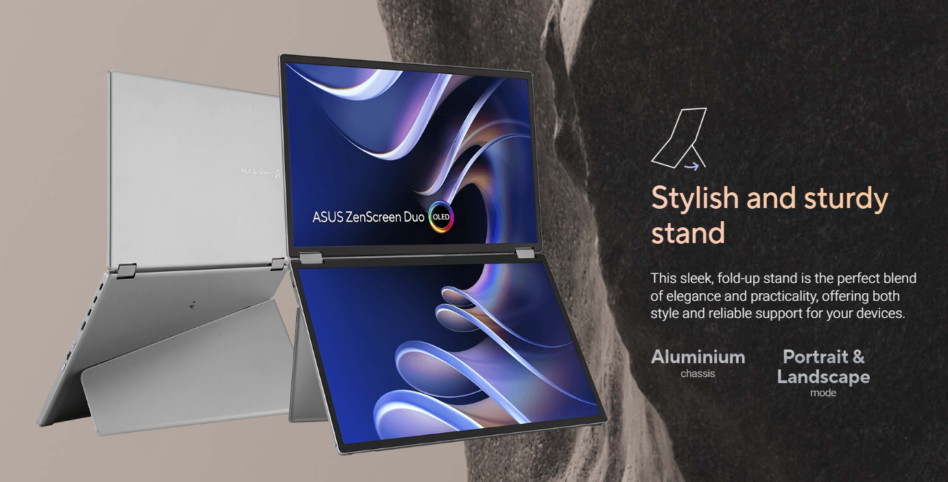 Màn hình đi kèm với chân đế gập ẩn bên trong, cho phép thiết bị đứng vững ở cả tư thế nằm ngang lẫn nằm dọc. Bạn có thể dễ dàng thiết lập không gian làm việc chuyên nghiệp tại bất kỳ đâu, từ bàn làm việc tại nhà đến bàn ăn trong khách sạn.