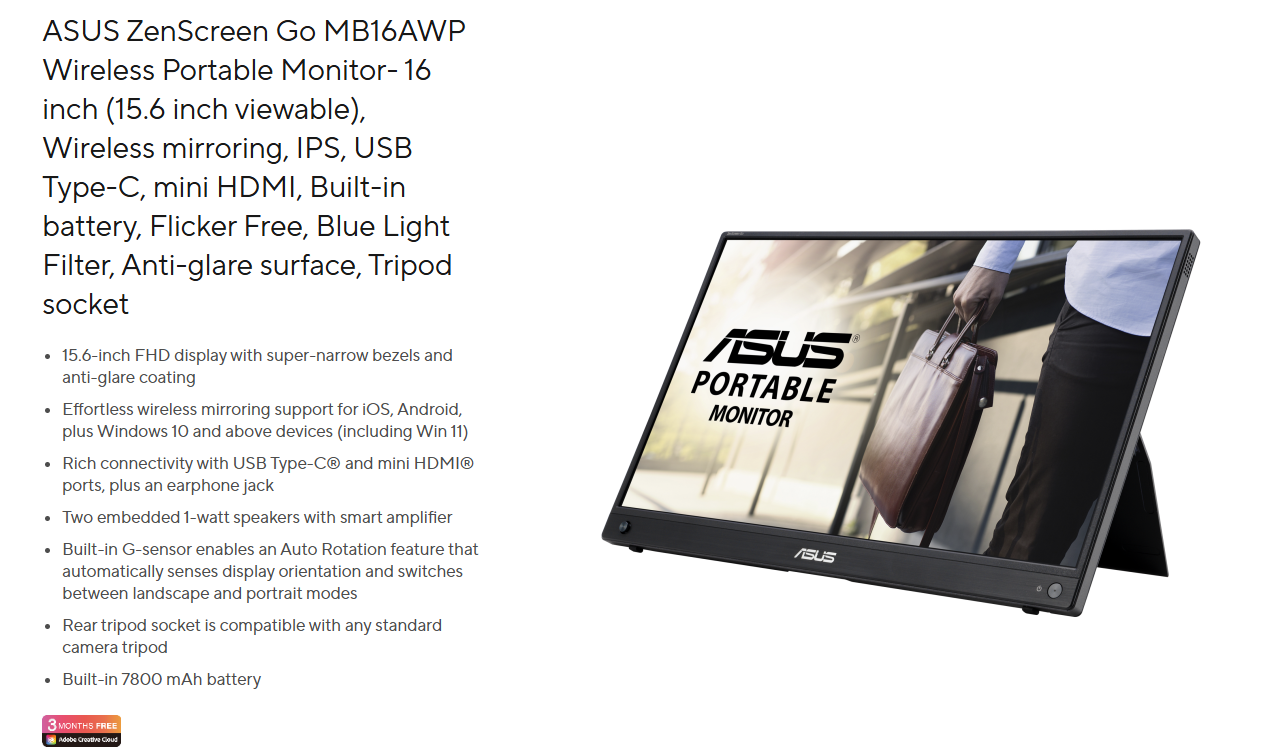 Màn hình Asus ZenScreen Go MB16AWP là sự lựa chọn hàng đầu cho những ai tìm kiếm sự tiện dụng tối đa. Việc tích hợp cả Pin và khả năng kết nối không dây biến nó thành một thiết bị độc lập mạnh mẽ, sẵn sàng nâng tầm trải nghiệm hiển thị của bạn ở bất cứ đâu trên thế giới.