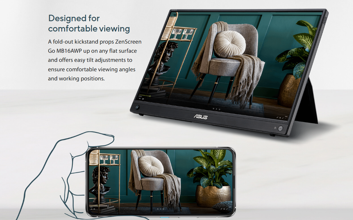 Nhờ cảm biến G-sensor tích hợp, ZenScreen Go MB16AWP có thể tự động nhận diện hướng đặt và chuyển đổi nội dung giữa chế độ ngang (Landscape) và dọc (Portrait). Chế độ dọc đặc biệt phù hợp cho việc đọc tài liệu dài, lướt mạng xã hội hoặc kiểm tra các dòng mã code.