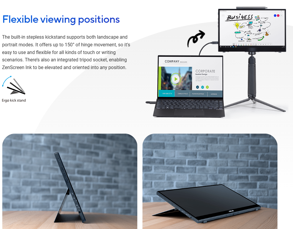 Khác với các dòng chân đế gập cố định, MB14AHD sở hữu chân đế bản lề vô cấp chắc chắn. Bạn có thể điều chỉnh màn hình đứng ở bất kỳ góc nghiêng nào từ 0 đến 150 độ. Điều này cho phép bạn đặt màn hình nằm ngang để vẽ hoặc dựng đứng để làm màn hình phụ một cách vững chãi.