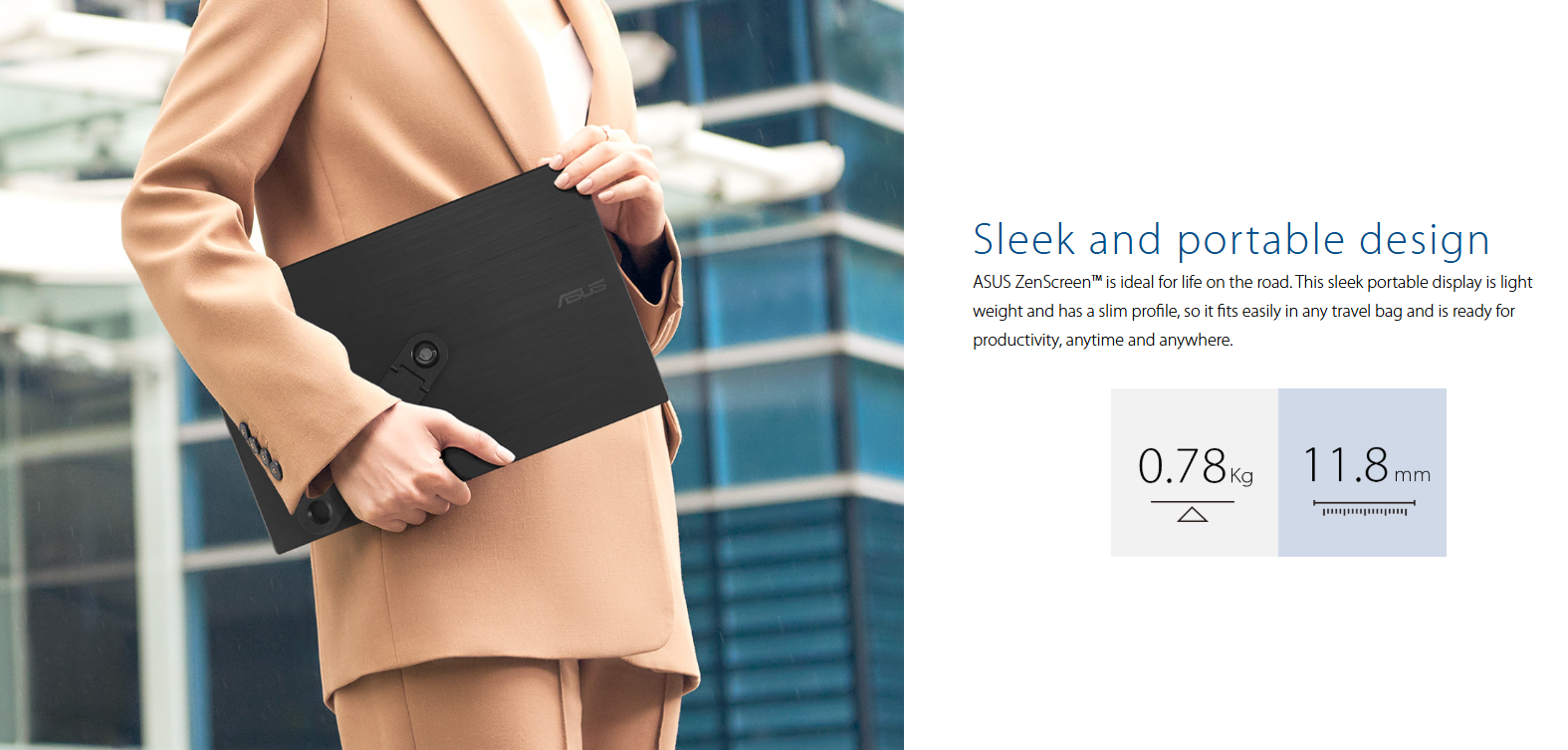 Với trọng lượng chỉ dưới 800g và độ mỏng ấn tượng, ZenScreen MB166CR dễ dàng nằm gọn trong túi xách hoặc balo cùng với laptop. Đây là người bạn đồng hành không thể thiếu cho các chuyến công tác hoặc những buổi làm việc "nomad" (di động) mà không gây nặng nề, vướng víu.